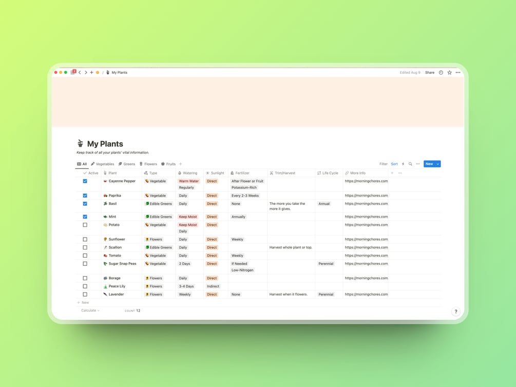 Elevate your plant-care game with this template designed for plant enthusiasts who want to meticulously track their plants' vital information.
