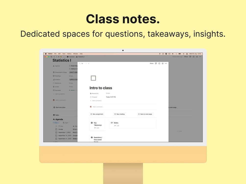 Stay organized and focused - start each new class with a pre-structured page featuring designated sections for main notes, key takeaways, questions/discussion points, insights/reflections. -
